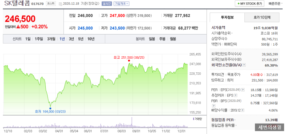 2020년 12월 18일 종가 기준으로 관련주의 대표주 SK텔레콤의 주가는 246,500원으로 코스피 시가총액 16위였습니다.
