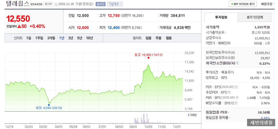 2020년 12월 18일 종가 기준 자동 운전 관련주의 대표주 텔레 칩스의 주가는, 12,550원으로 코스닥 시가 총액 순위 525위입니다.