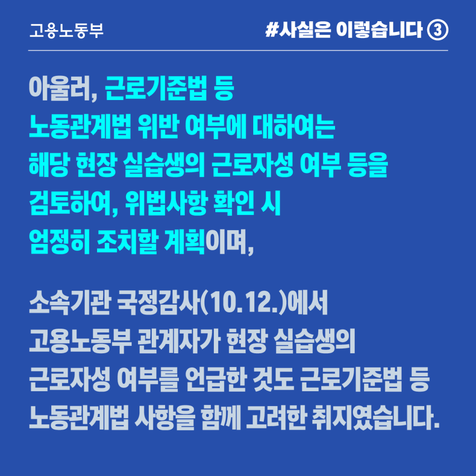 - 아울러 근로기준법 등 노동관계법 위반 여부에 대해서는 해당 현장실습생의 근로자성 여부 등을 검토해 위법사항 확인 시 엄정 조치할 계획이며, 소속기관 국정감사(10월 12일)에서 고용노동부 관계자가 현장실습생의 근로자성 여부를 언급한 것도 근로기준법 등 노동관계법 사항을 함께 고려한 취지였습니다.