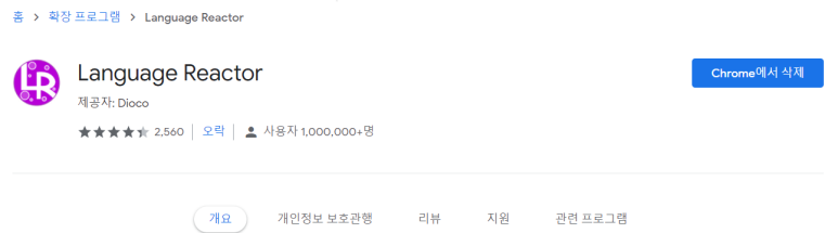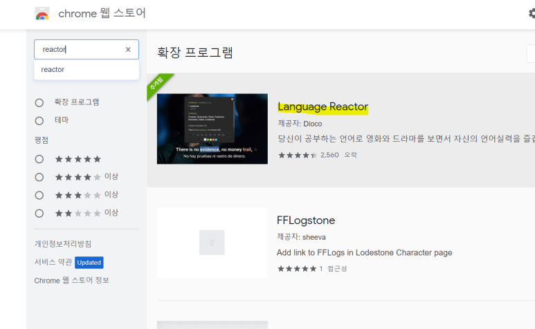 그러면 이렇게 한영 자막이 동시에 나오도록 도와주는 langugereactor가 검색됩니다.화면을 클릭하면,