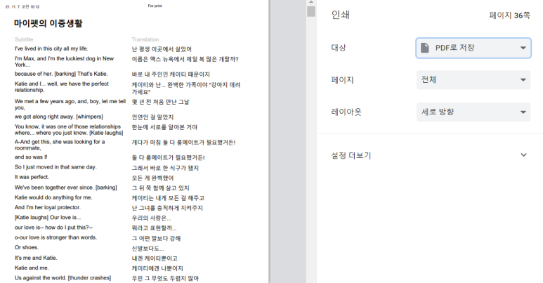 그러면 대본을 pdf나 종이로 출력할 수는 없을까요?