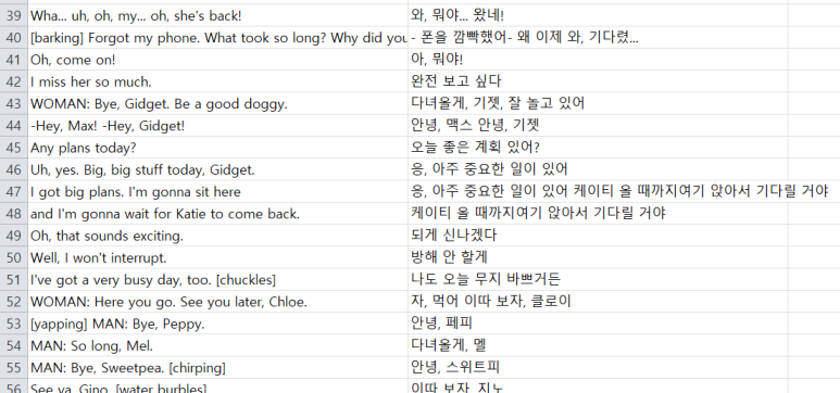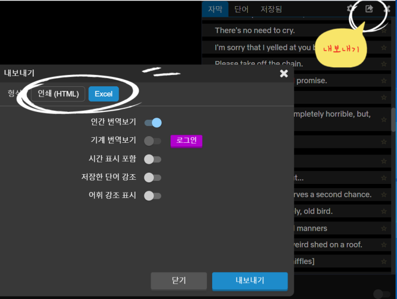 엑셀로 출력할 때는 원하는 부분의 문장만 따로 학습하고 싶을 때 한영 대본 수정을 위해 이용합니다.