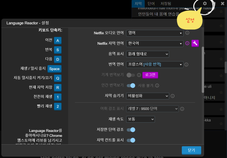 이렇게 설정에 들어가서 자막언어, 번역언어를 내가 학습하고 싶은 언어를 선택하고 닫기를 누르면? (저는 아름다운 발음 프랑스어를 선택했습니다.)