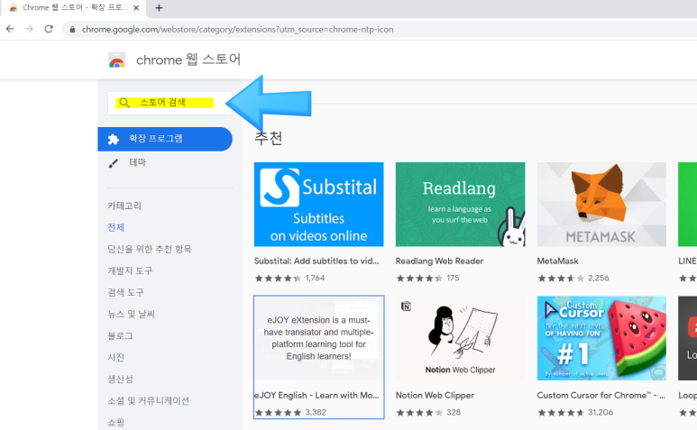 크롬 왼쪽 상단에 ‘앱’이라고 표시되어 있는데 선택 후 ‘크롬 웹스토어’로 들어갑니다.