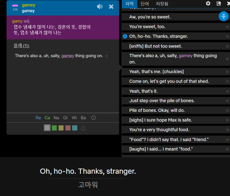 대사 중에 모르는 단어가 있으면 이렇게 개별적으로 선택을 해서 단어의 의미도 확인할 수 있습니다.