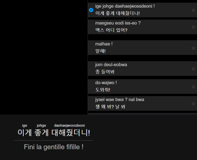 그리고 화면의 오른쪽 버튼을 눌러 영어 대사까지 확인할 수 있습니다.