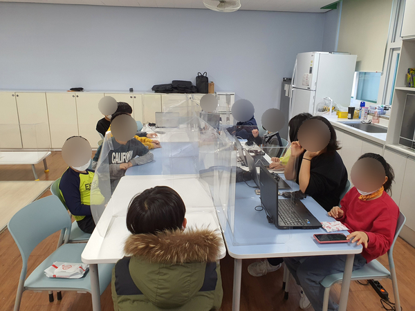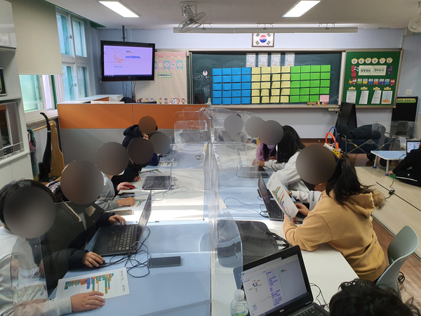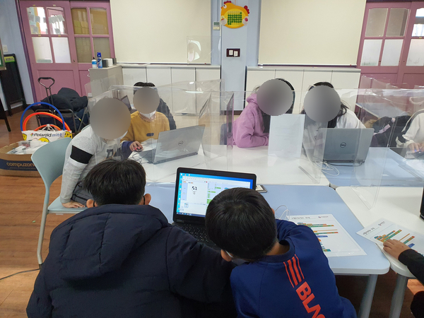 학생 두 명이 한 조가 되어 실습을 했습니다.실습에 사용한 프로그램은 블록코딩 방식이라 초등학생들이 어렵지 않게 체험할 수 있었습니다.