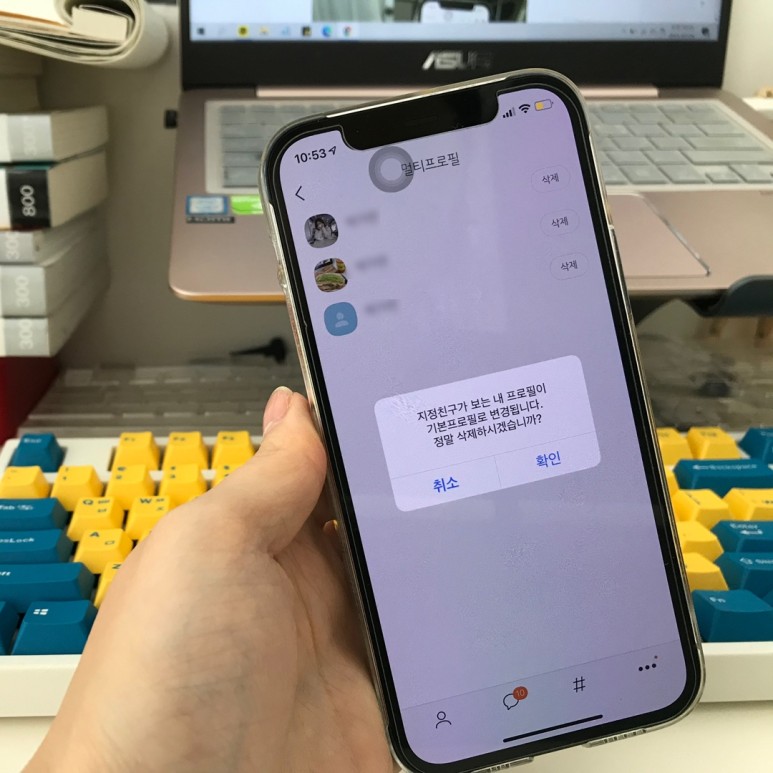 예시로하나삭제해보겠습니다. 그러면 해당 프로필에 설정해 놓은 친구가 기본 프로필을 보면 안내창이 나타납니다. 확인을 눌러주시면