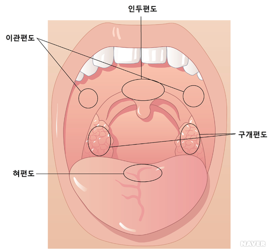 편도선은 위치에 따라 달라집니다.목 양쪽에 보이는 구개선, 아데노이드라고 불리는 인두 편도, 혀 뿌리 부분에 있는 설편도가 있습니다.이 세 개의 편도선을 편도륜이라고 부릅니다.