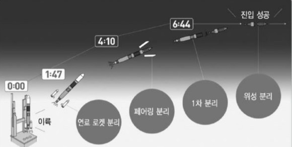 3. 인공위성 발사과정과 정지위성 그림은 인공위성 발사과정을 시간별로 나타낸 모형입니다. 최초로 발사 추진체로 사용된 연료 로켓이 분리되고 위성이 대기권을 떠나는 동안 열과 압력으로부터 보호하기 위해 사용된 페어링이 분리됩니다.