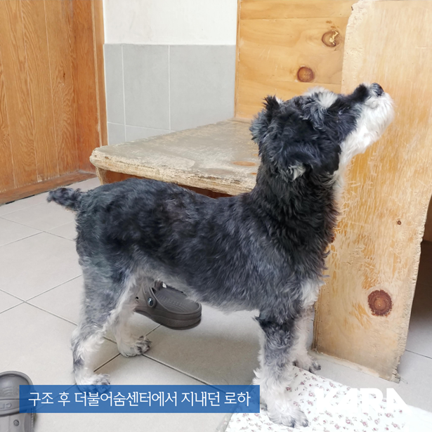 가족에게 버림받았지만 로하에게 다시 새로운 가족을 찾아주고 싶었어요. 그러나 로하는 만성적인 탈장을 가지고 있어 흥분하면 지속적으로 탈장이 재발했고 그때마다 탈장 수술을 받았습니다. 언제 탈장이 될지 모르는 로하는 그렇게 카라와 함께 호흡센터에서 지내며 건강관리를 계속했습니다.