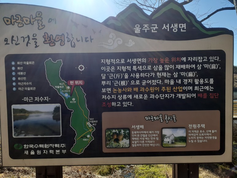 서생면 마근마을에 저수지가 있다.화산저수지로 불렸지만 현재는 마근저수지로 불리고 있다.