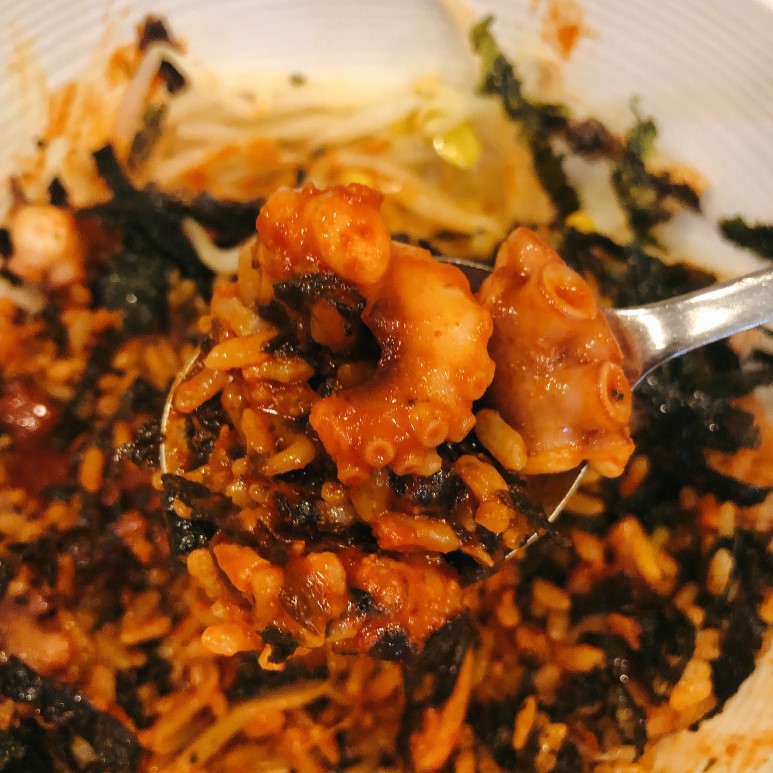 모락모락 김이 모락모락 나는 기름 정낙지를 섞어서 무리 없이 한 그릇 문지를 수 있을 정도면 꽤 매운 거 잘 먹는 거죠?