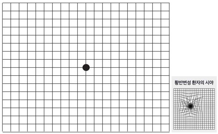 격자선, 휘거나 잘려 보일 수 있습니다, 황반변성 망막 중심부에 위치한 신경조직이 상이 맺어지는 황반과 주변부에 퇴행성 변화가 일어나는 질환인 황반변성은 초기에는 거의 증상이 없지만 사물이 휘어 보일 수 있습니다. 질병이 진행되면서 물건의 중심부가 검게 보이지 않게 되고 글자 사이에 공백이 생기거나 중심 부분이 사라진 것처럼 보이지 않게 됩니다.