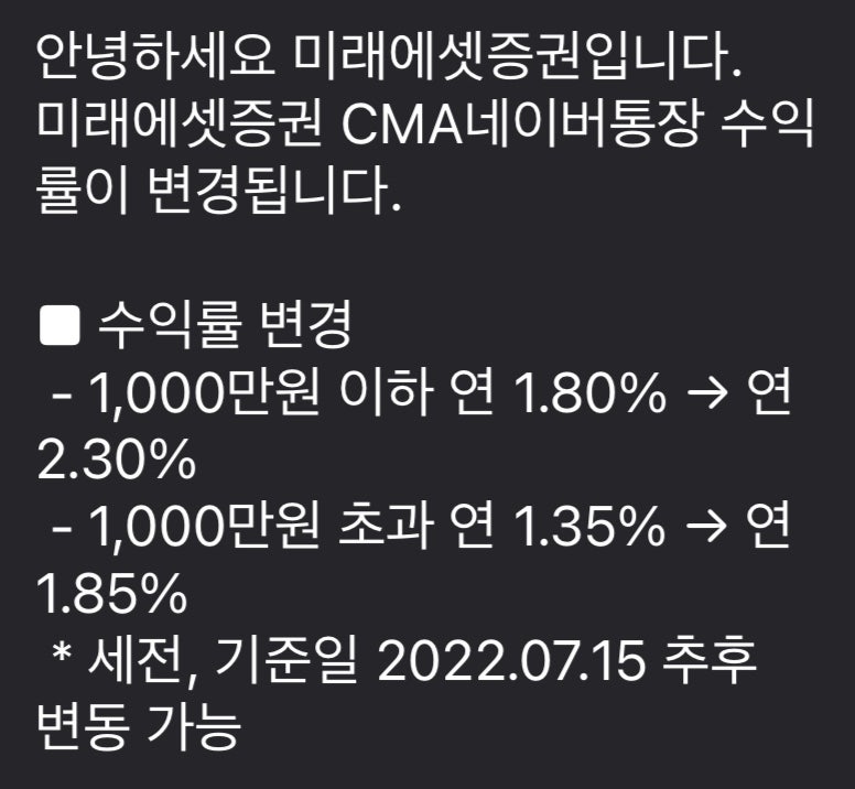 지난 8월 28일까지 미래에셋대우 네이버통장 금리는 세전 2.3%가 적용됐습니다. 하지만 8월 29일부터 수익률을 끌어올린다는 안내를 받았습니다.앞서 소개한 KB증권 CMA와 마찬가지로 1,000만원 이하까지 세전 2.55% 금리로 인상해줬다는 안내를 오늘 받았습니다! 다른 곳으로 옮길까 했는데 다행이네요~