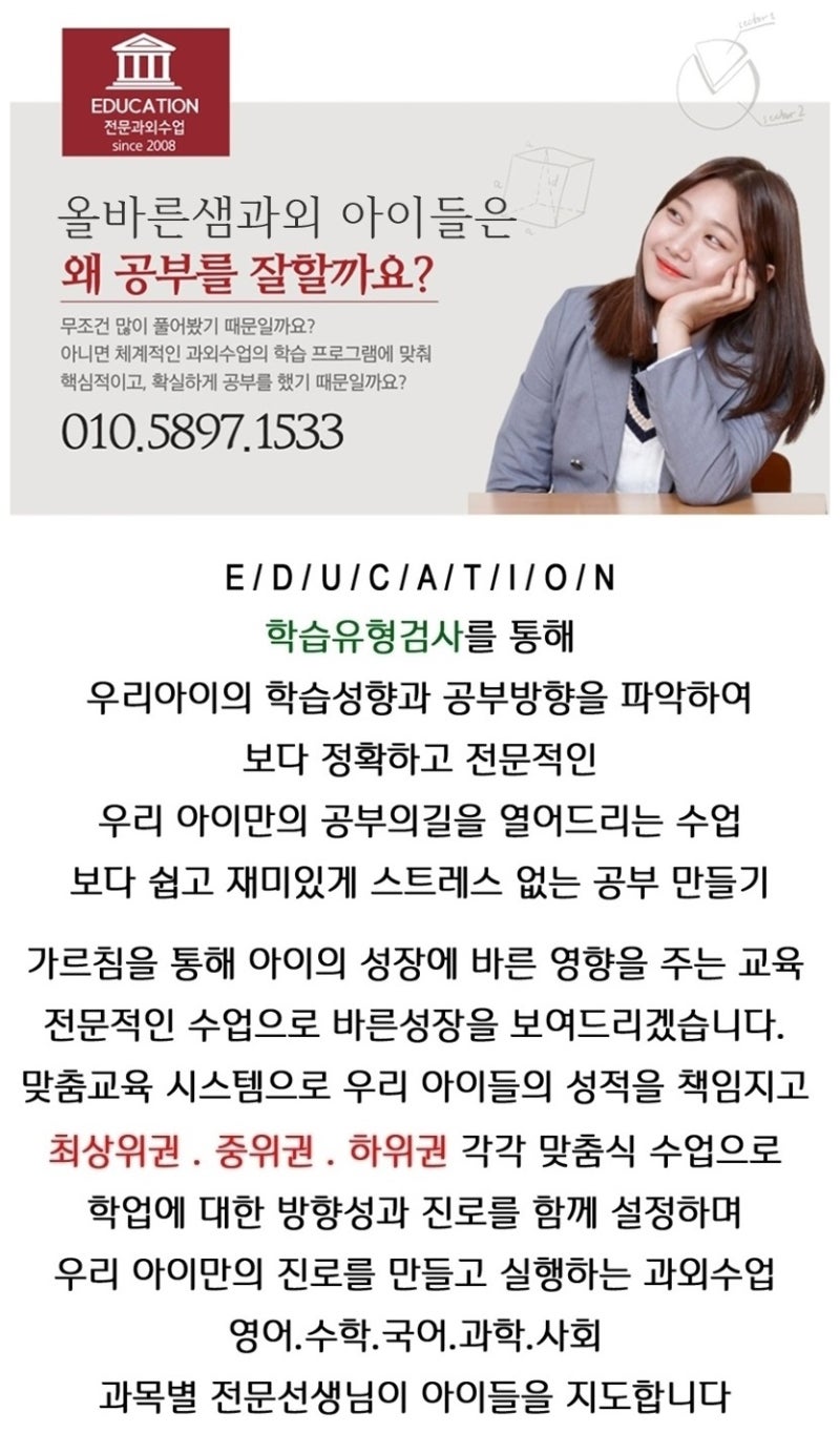 집중하지 않으므로, 졸면서 공부할 수 있습니다. 수업 시간에 강조한 부분을 다시 한번 확인하고 문제를 푼 때에 잘못된 문제도 다시 풀었습니다. 나는 수업 중에 한번도 졸지 않았습니다. 우수 사례를 보면서 평가를 어떻게 수행할지 방향을 못 잡고 좋습니다. 공부에 관심이 없어서 공부하라고 하면, 아이가 짜증 나네요.또 수행 평가를 보다 잘 미사 신도시 영어 학원을 이해하려면 좋은 배경 지식을 가져야겠습니다. 틀린 답안은 교과서를 참고 다시 한번 기억하고 보면 기억이 생생합니다. 처음에는 문제집 몇장을 푸는 데도 상당한 미사 신도시 수학 학원 시간이 걸리고 당황했습니다만, 학습 수준이 높아지면서 미사 신도시 종합 학원의 문제 풀이 시간도 점점 짧아지고, 도중에 공부를 포기하지 않는 태도가 중요하다고 생각합니다. 나머지 시간은 취약한 과목을 보충하기 위해서 사용됩니다. 시험을 준비하면서 보완해야 할 점과 좋은 점이 무엇인지, 저번 시험 보다 좋은 점과 어떤 문제를 풀었는지 등을 꼼꼼히 분석했습니다.수행평가에서는 서술/논술형 평가 비중이 가장 높고, 학교미사신도시 중등수학학원 선생님께서 평가의 주제와 범위를 알려주시면 해당 미사신도시 중등영어학원 수업을 들으면서 공부에 집중하게 됩니다. 이렇게 시험기간이 아니더라도 방과후, 주말을 이용해 예습, 미사신도시 고등수학학원 복습을 하면 상위권 성적을 유지할 수 있습니다. 문제집은 정리 미사 신도시 고등영어학원 노트와 함께 복습에 사용됩니다.수행평가에서는 서술/논술형 평가 비중이 가장 높고, 학교미사신도시 중등수학학원 선생님께서 평가의 주제와 범위를 알려주시면 해당 미사신도시 중등영어학원 수업을 들으면서 공부에 집중하게 됩니다. 이렇게 시험기간이 아니더라도 방과후, 주말을 이용해 예습, 미사신도시 고등수학학원 복습을 하면 상위권 성적을 유지할 수 있습니다. 문제집은 정리 미사 신도시 고등영어학원 노트와 함께 복습에 사용됩니다.