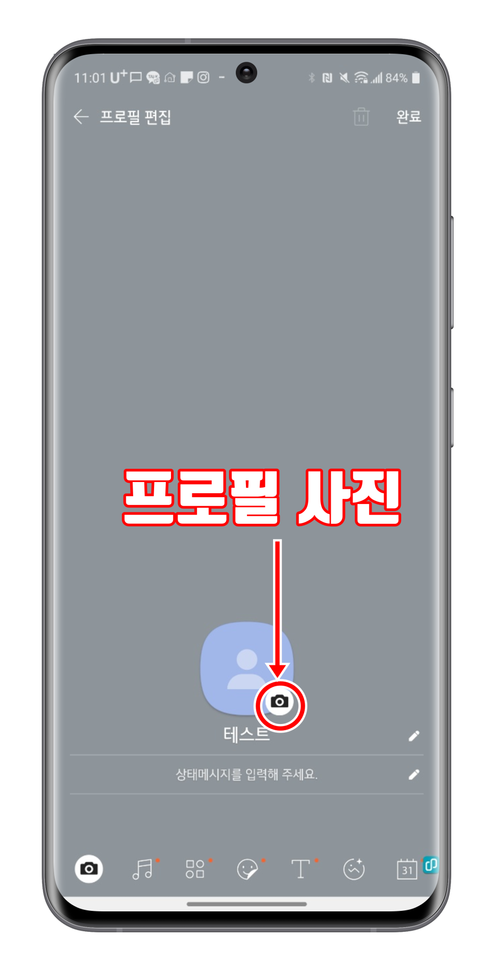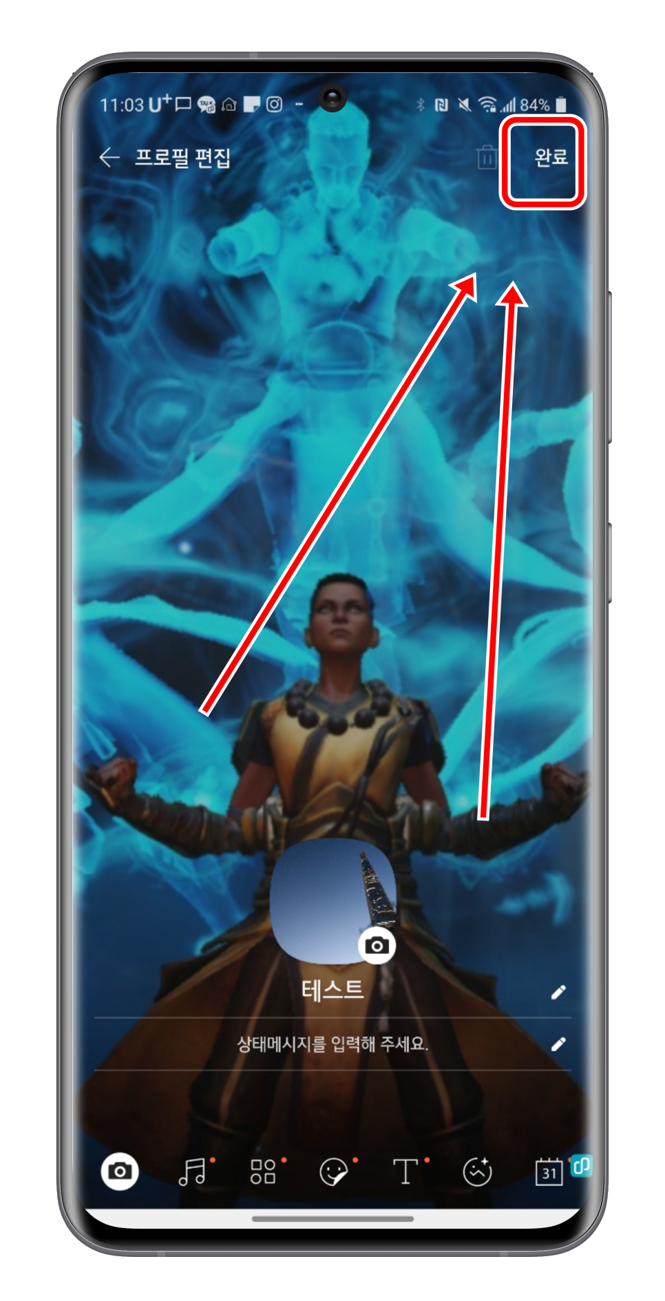프로필 짤이 바뀐 걸 확인할 수 있어요 종료하기 위해서는 우측 상단의 ‘완료’ 버튼을 누르면 다른 사람에게도 바뀐 화면을 보여줍니다.