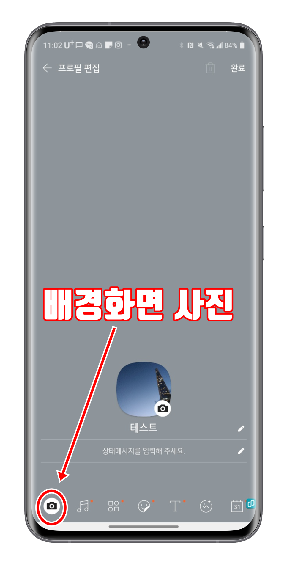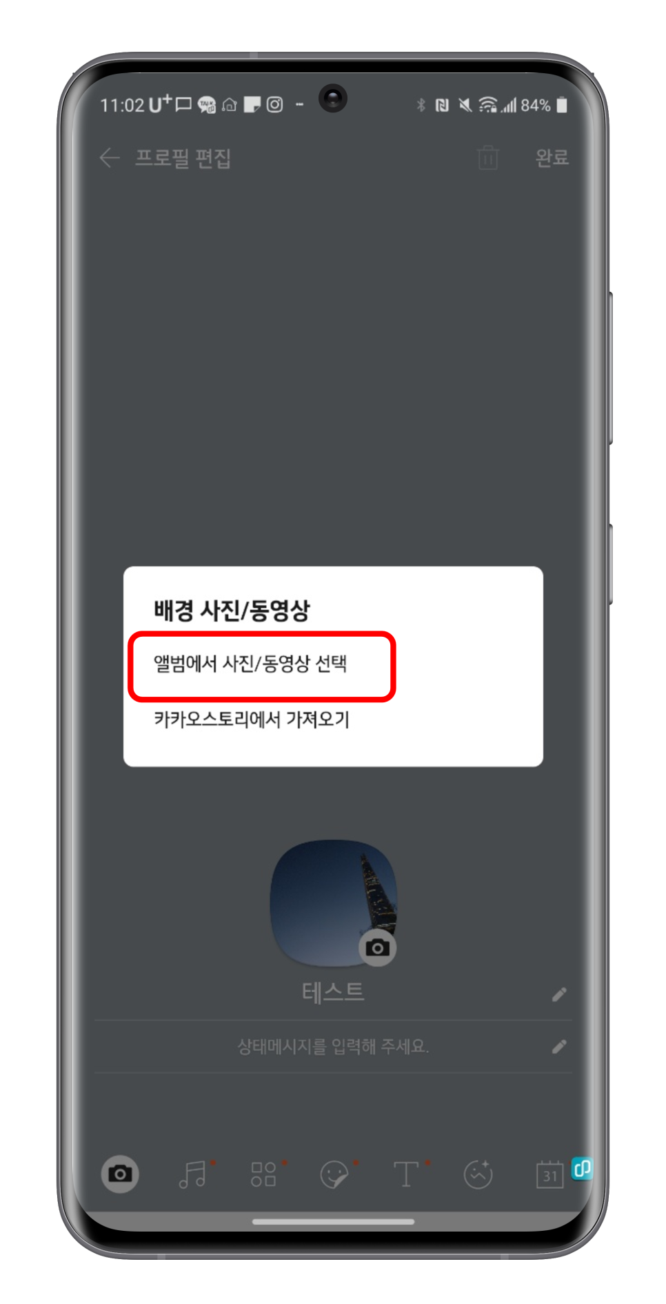 배경 화면을 바꾸기 위해서, 왼쪽 아래에 있는 카메라 버튼을 눌러 주세요. 그리고 아까와 같이 앨범에서 사진/동영상 선택을 누릅니다.
