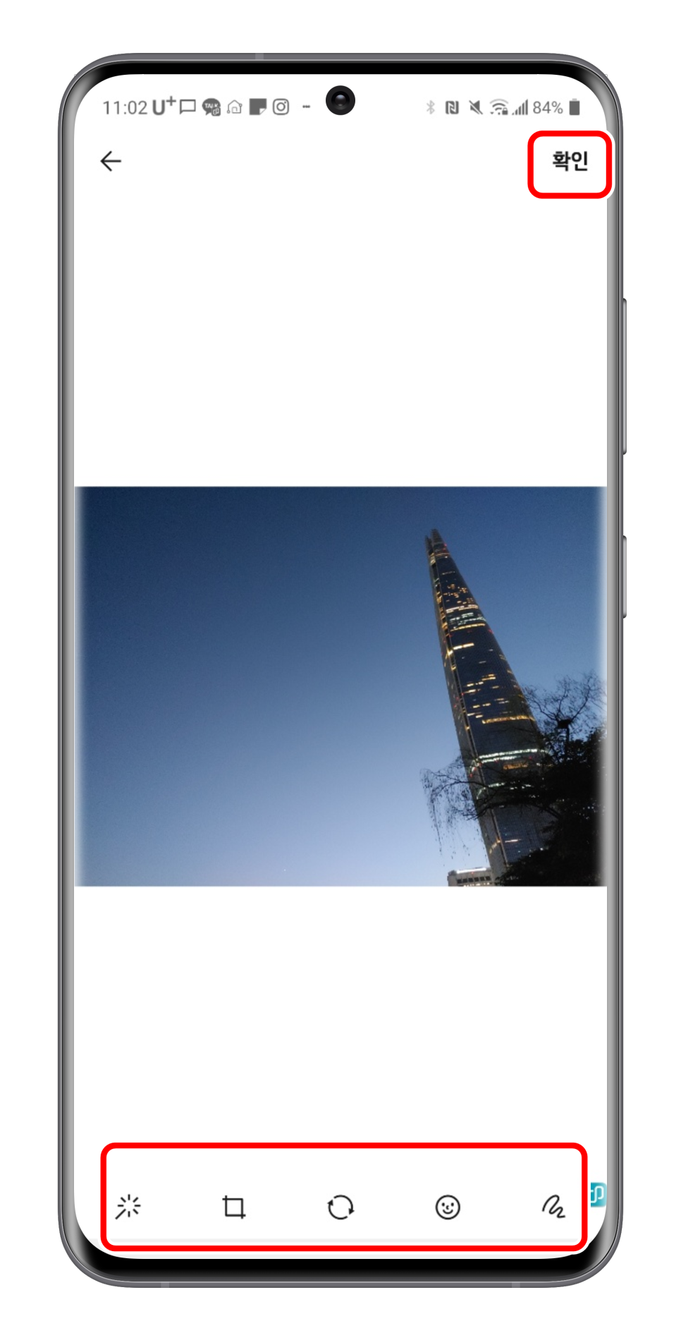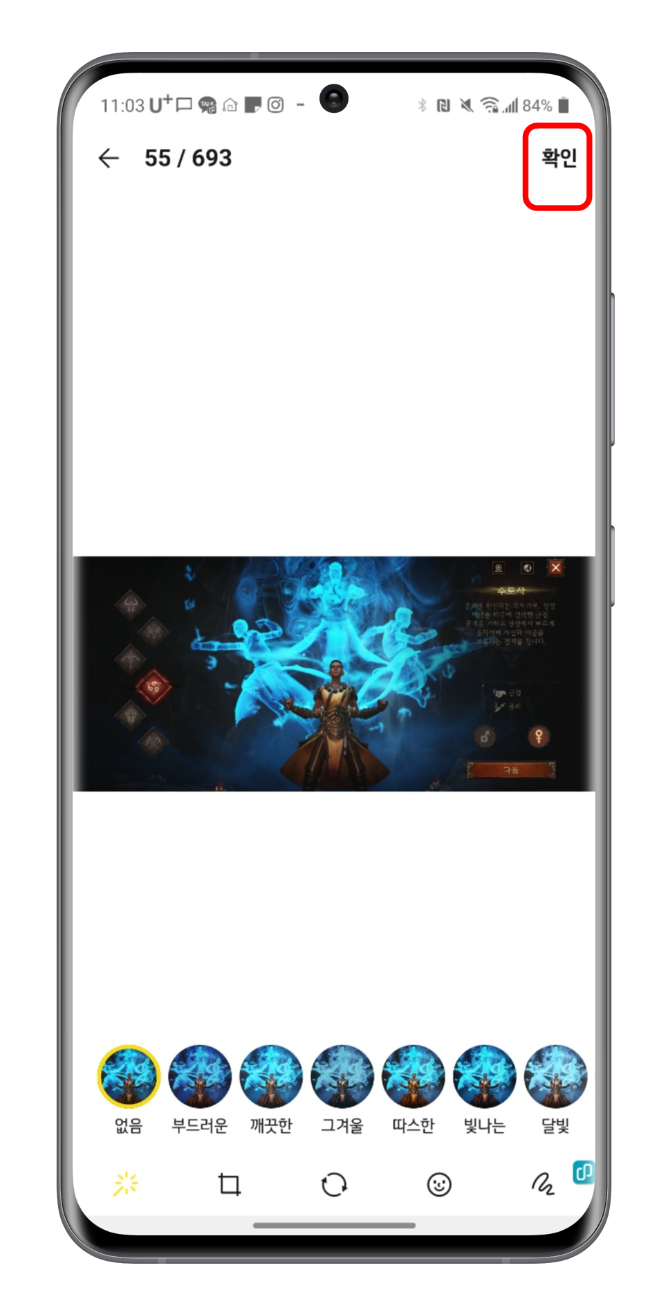 여러분의 앨범이 공개가 됐습니다 마음에 드는 사진을 선택해 클릭합니다. 사진을 선택하면 사진이 크게 나오고 밑에 여러 아이콘들이 나와요 사진의 사이즈를 바꾸거나 재미있는 이모티콘을 넣거나 색을 바꾸거나 하는 기능입니다. 어렵다고 생각되면 만지지 않아도 괜찮으니 오른쪽 위의 확인을 눌러 주세요.