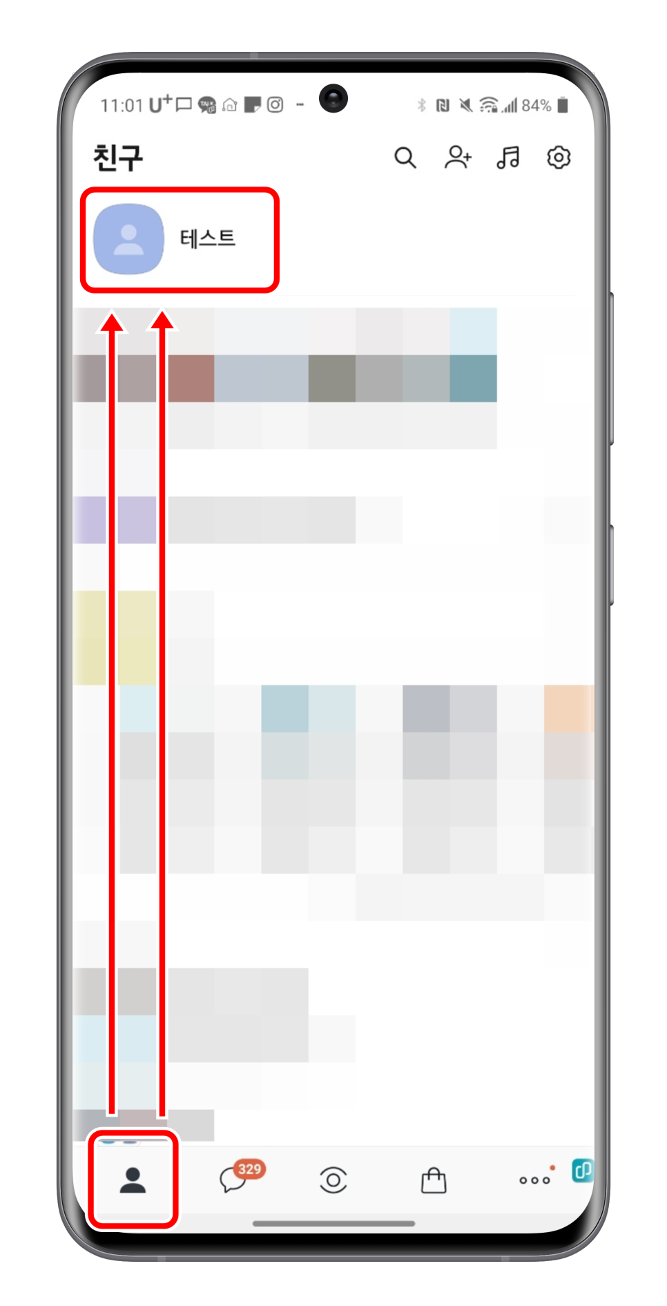 카카오톡 프로필 배경화면을 바꾸기 위해 가장 먼저 해야 할 일은 스마트폰에서 카카오톡을 실행한 후 내 프로필 화면으로 이동하는 것입니다 위 사진처럼 왼쪽 아래 사람 모양 아이콘을 클릭하시고, 상단에 있는 자신의 프로필 아이콘을 클릭하세요.