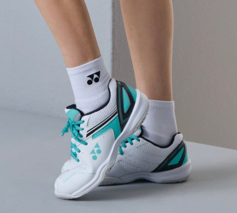 제가 사용하는 제품은 요넥스 SHB-31EX이고 흰색 운동화에 민트색 포인트가 있어요!