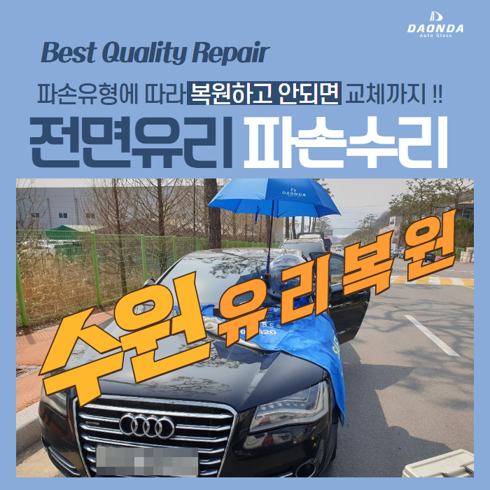 오늘 소개해드릴 내용은 수원유리복원 아우디 전면유리 파손수리 출장시공내용입니다.다온다 자동차유리 미국 NWRD (National Windshield Repair Division) 국제자동차유리수리협회 국내 최초 공인수리기술자 자격인증 보유