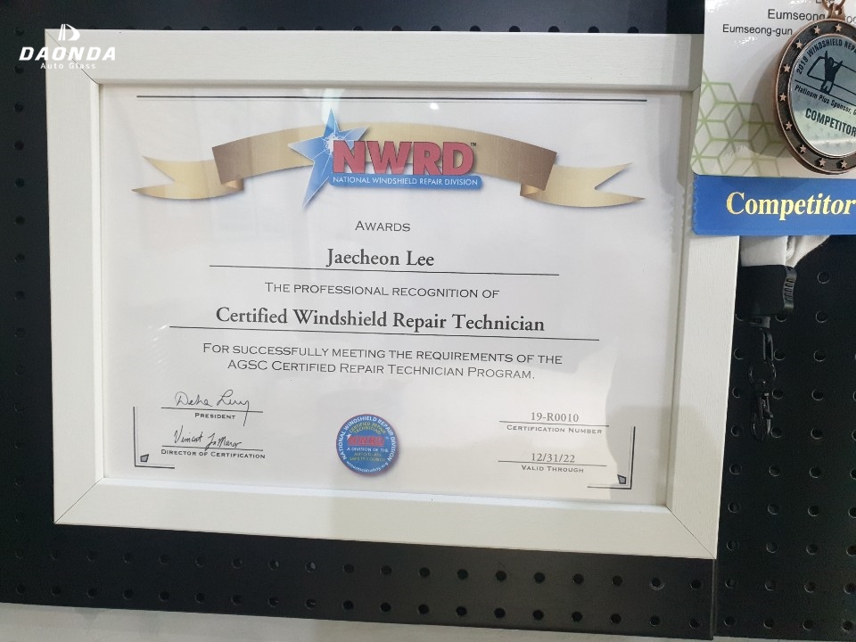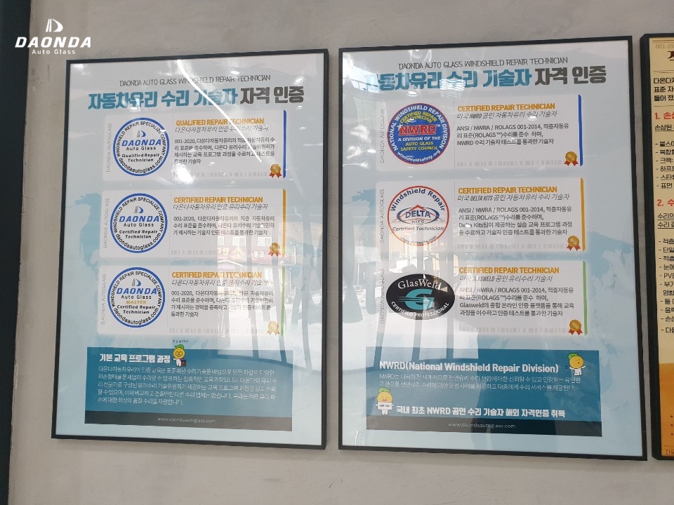 다온다 자동차 유리 전국의 시공점은 모두 매뉴얼로 수리를 실시하고 있습니다. 또, 다온다의 표준화된 수리 기술에 따르도록 교육.훈련받고 지속적인 기술교육을 통해 최고의 품질수리를 보여줄 수 있습니다.각종 자격 인증을 보유하고 믿을 수 있는 수리 품질을 자랑합니다.