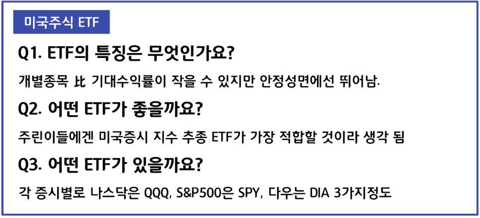 마지막으로, 츄린등에 가장 적합한 미국주식의 투자 방법인 ETF에 대해 알아보자」(ETF의 개념에 대한 설명은 별도 하지 않는다).