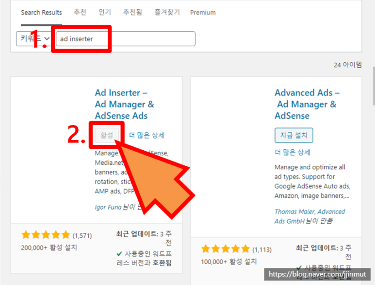 검색창에서 「adinserter」라고 검색하면, 다음과 같이 플러그 인이 나옵니다.[지금 설치]를 클릭한 후 [활성화] 버튼을 눌러 활성화합니다.