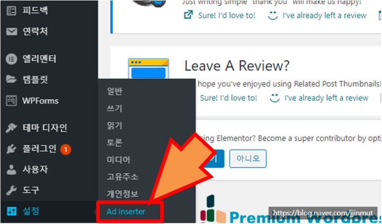 3) 좌측 메뉴바에서 [설정] [Ad Inserter]를 클릭합니다.