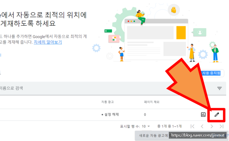 3. 애드센스 자동광고 활성화 그리고 다시 애드센스 페이지로 돌아갑니다.1) 오른쪽의 [연필] 마크 아이콘을 클릭합니다.