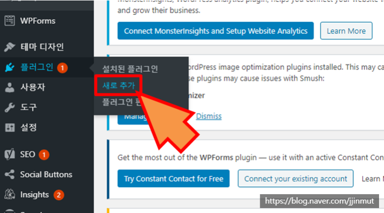 2. Ad Inserter의 인스톨 및 코드 삽입1) 본인의 워드프레스 관리자 모드로 들어갑니다.좌측 메뉴에서 [플러그인] – [신규 추가]를 클릭합니다.