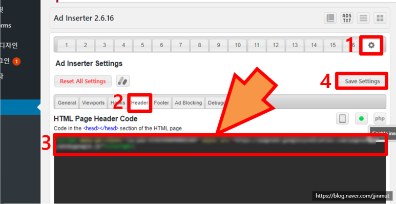 4) 좌측의 [톱니바퀴 모양]의 설정에 들어가 [Header]를 클릭해 복사한 어드센스 html 코드를 「붙여넣기」합니다.[ Save settings ] 버튼을 클릭하시면 저장이 완료됩니다.