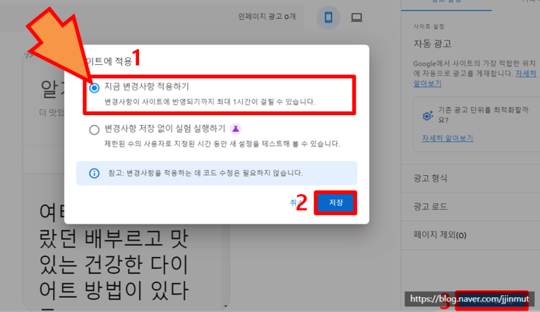 저는 [지금 변경사항 적용하기]으로 [저장]하고 [사이트에 적용]했습니다.