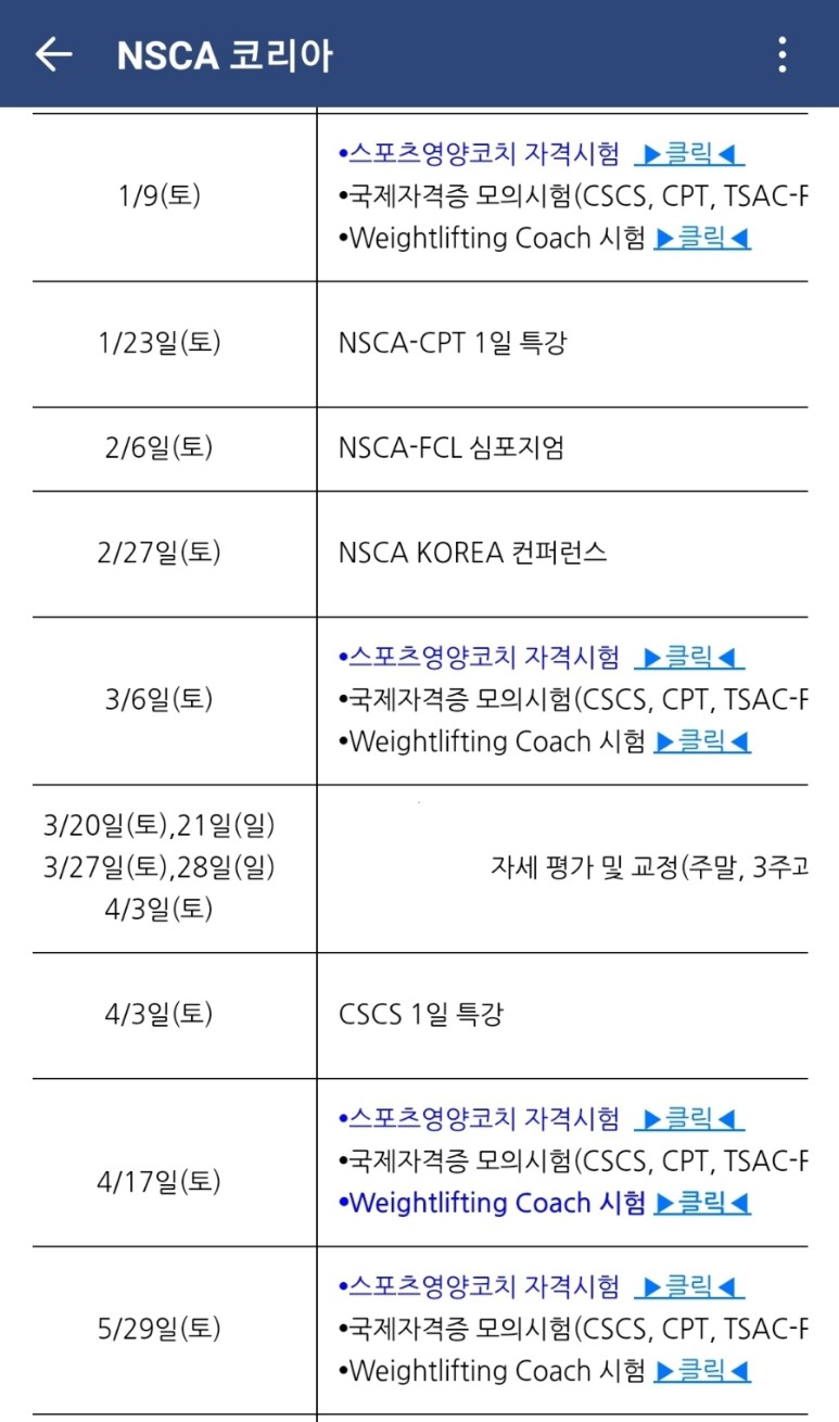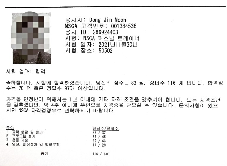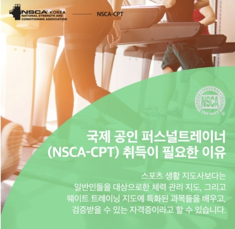 NSCA Korea에서는 보다 쉽게 위 자격증을 취득할 수 있도록 전 과정을 지원하며, 취득 후 자격 갱신을 위한 작업도 지원하는 국내 기관입니다. 저 또한 많은 정보를 홈페이지를 통해 얻고 시험을 보았지만 중간에 개인적인 실수로 합격해도 수료증을 따지 못할 뻔 했습니다. 자세한 내용은 글의 뒷부분에 나와요.ㅜㅜ