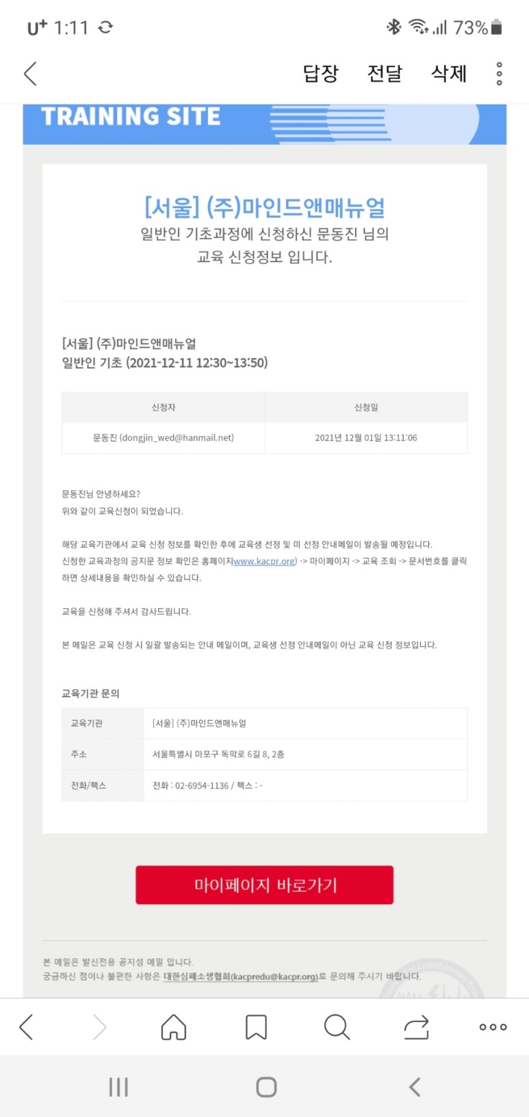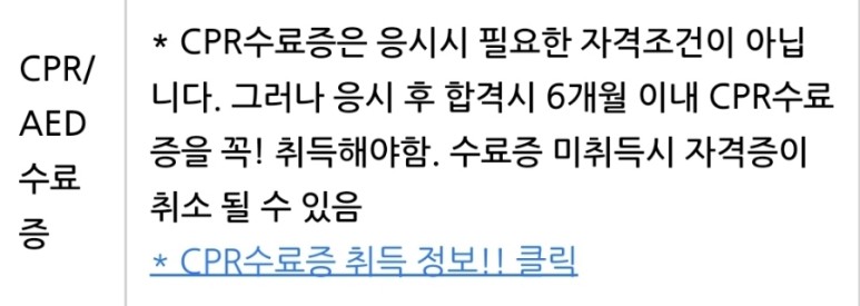 하지만 끝이 아니야. 자격증을 따려면 CPR 심폐소생술 교육을 받고 이수증을 제출해야 한다.ㅜㅜ