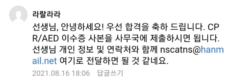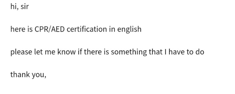 소속이 미국본사 회원인데 여기로 이수증을 보내달라고 해서 심폐소생술 이수증 한글로 된것을 보냈더니 영어로 써서 보냈어ㅜㅜ