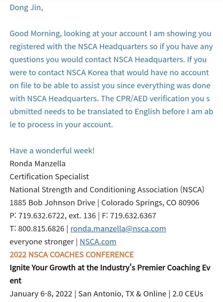 상기 수료증을 nscakorea 사무국에 전달하였는데, 여기서 황당한 상황이 발생. 사무국 직원은 이수증은 잘 받았는데 자격증을 발급하려고 확인해보니 내 이름으로는 회원 등록이 안 돼 있다고 하니 어떻게 시험을 봤겠느냐고 반문한다며 알고 보니 나는 Korea 사무국을 통해 시험 접수를 한 게 아니라 미국 본사에 직접 회비를 낸 상황. 이렇게 되면 Korea 사무국에서는 회원 관리를 할 수 없다고 한다. 심지어 수료증이 미국에서 올 때 잃어버려도 자신들에게는 가져갈 수 없다고 한다.ㅜㅜ
