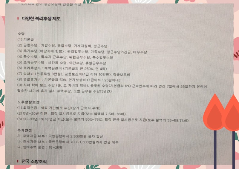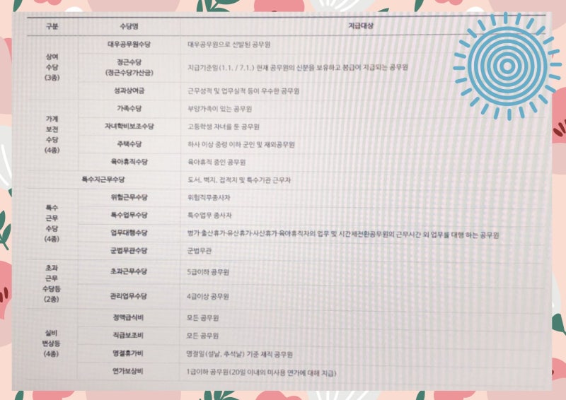 다음으로 조사한 것은 소방공무원 수당입니다. 급여가 기본급+수·당으로 구성된다고 하니 어떤 수당을 지급하시는지 갑자기 궁금했어요. 공무원 급여가 박봉이긴 하지만 그 중에서도 가장 많은 급여를 받는 게 경찰, 소방이래요. 기본급이 조금 더 높은 것도 있지만 수당도 많이 받기 때문이래요. 확인해보니 상여, 가계보전, 특수지근무, 특수근무, 초과근무, 실비변상 등 다양한 수당의 종류가 있었습니다. 이 중에서 서방아.관이 주로 받는 수당은 특근, 초과근무수당 등이라고 합니다. 다양한 소방공무원 수당을 받을 수 있기 때문에 다른 공무원에 비해 많은 급여를 받을 수밖에 없는 것 같습니다.