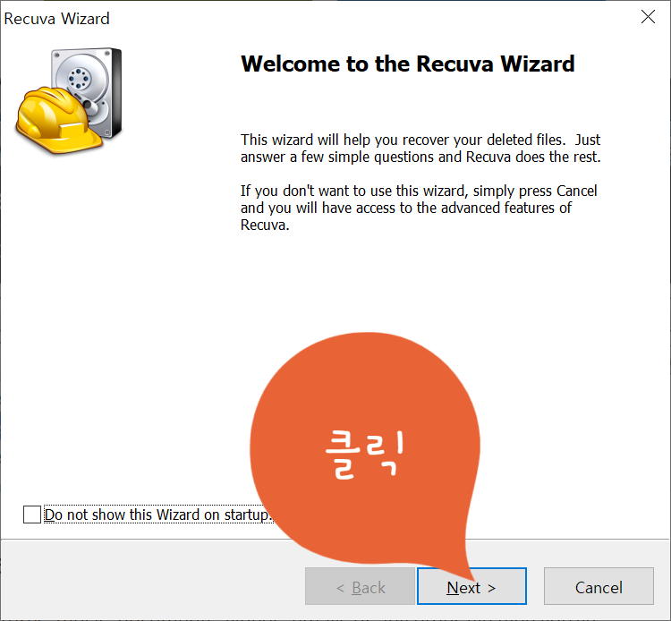 Recuva 설치 후 실행하면 아래와 같이 RecuvaWizard(렉바 마법사)가 실행됩니다. Next를 클릭합니다.