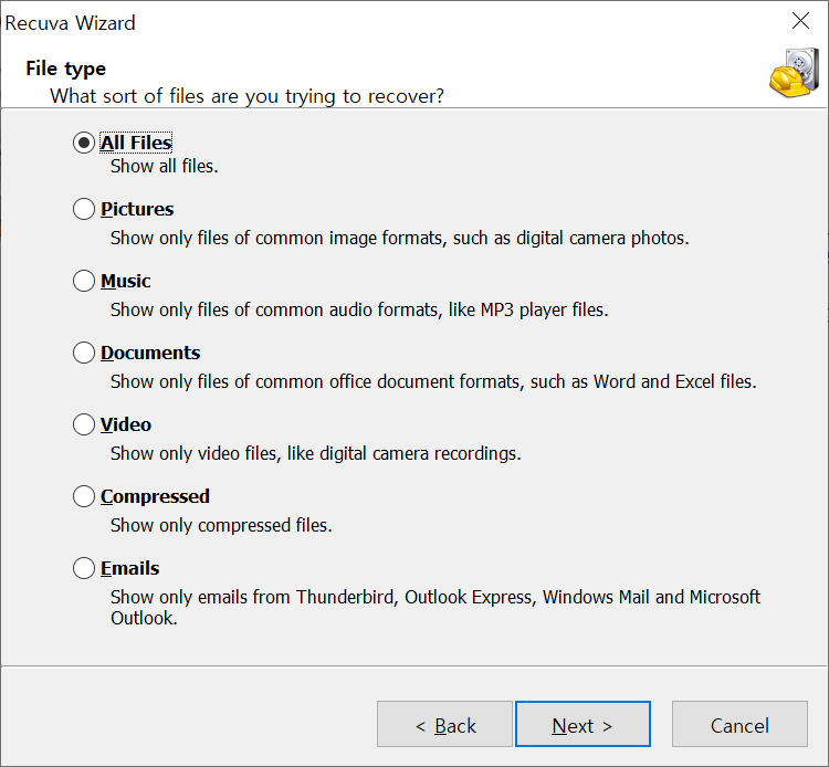 복구 마법사 시작 복구에 관한 설정 창입니다. 파일의 종류에 관계없이 복구할 수 있도록 맨 위의 All Files를 그대로 선택하고 Next를 다시 클릭합니다.