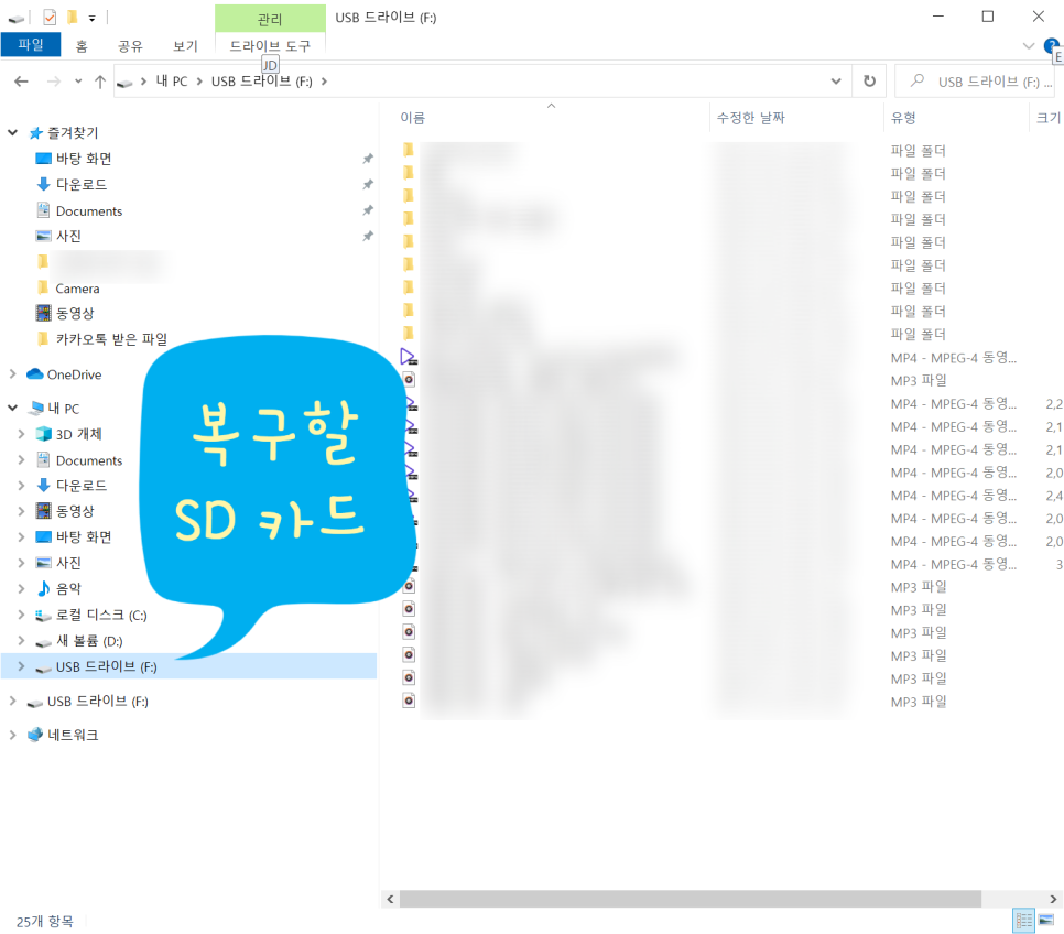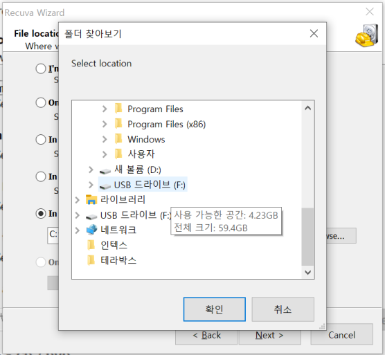 복구할 드라이브 지정 #1 폴더 검색창에서 USB 드라이브(F:)를 지정한 후 확인을 클릭합니다.