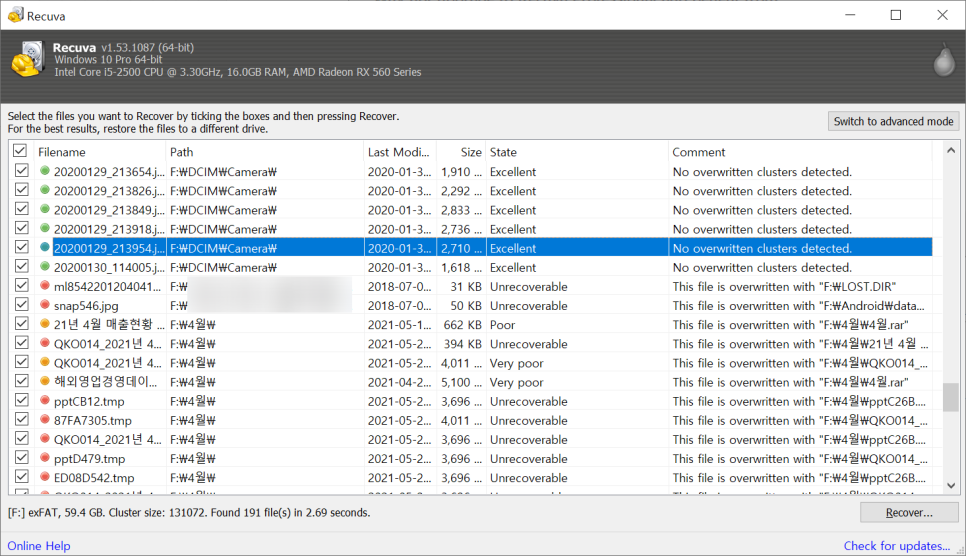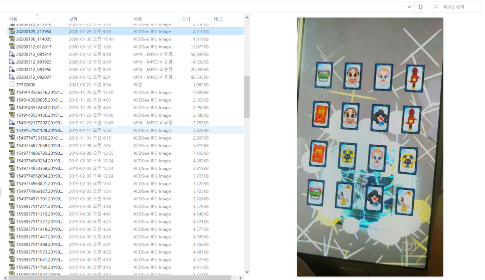 복구 전 목록-파일명 20200129_213954jpg 녹색으로 표시된 파일의 복구 결과는 정상이네요.