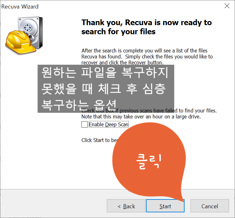 Start 클릭 EnableDeepScan 옵션은 원하는 파일을 복구하지 못했을 때 체크하여 심층 복구를 수행하는 옵션으로 복구 시간이 오래 걸린다는 단점이 있지만 복구하지 못한 파일을 복구할 수 있는 확률이 증가합니다. 우리는 일단 Deep Scan은 하지 말고 진행해 보도록 합시다.