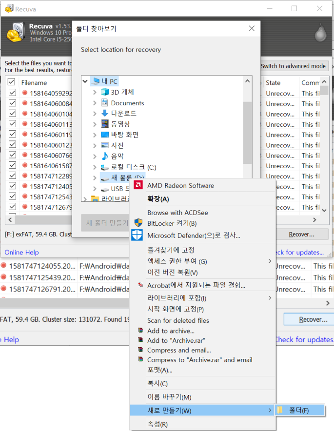 복구할 파일의 선택, 복구할 파일의 선택을 마치면 복구할 파일을 어디에 저장할지를 선택해야 합니다. 파일을 저장하는 위치는 반드시 SD카드와 다른 저장공간이어야 합니다. 그러면 복구할 파일이 훼손되지 않습니다. Ace의 컴퓨터에는 2개의 스토리지가 있습니다. C드라이브는 SSD, D드라이브는 일반 하드디스크이기 때문에 D드라이브로 복구할 파일을 저장할 폴더를 생성했습니다.