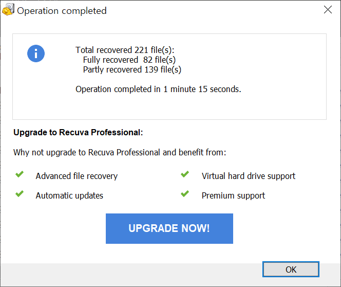 DeepScan 활성화 후 복구 결과 DeepScan 활성화 옵션으로 복구 결과 작업시간은 1분 15초가 소요되었으며 총 221파일 중 82개의 파일이 완전히 복구되었으며 139개의 파일이 부분 복구되었습니다.