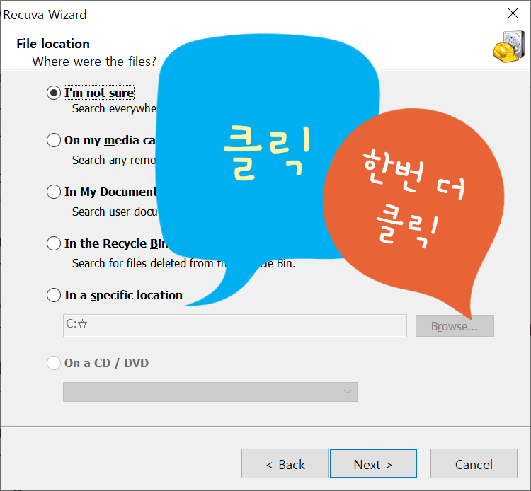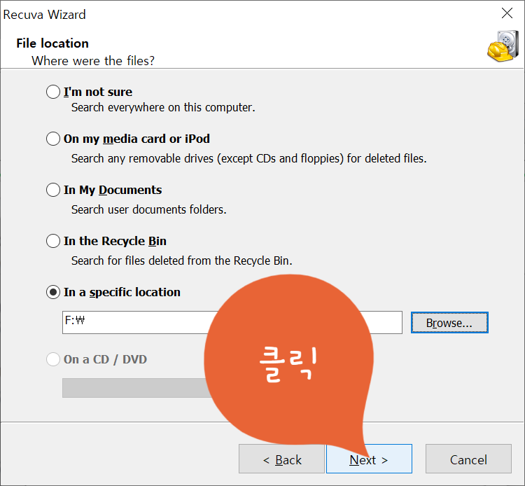 복구할 파일의 종류를 선택 복구하는 대상이 어디인지를 지정하는 메뉴입니다. 아까 복구하는 파일이 저장된 SD카드가 F드라이브로 지정되어 있었습니다. F 드라이브를 지정하기 위해 Inaspecificlocation을 클릭한 다음 오른쪽 Browse를 다시 클릭합니다.