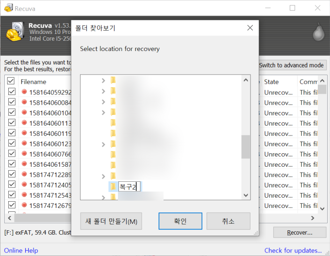 다른 스토리지에 복구할 파일을 저장할 폴더 만들기 #2 복구 2 폴더를 하드 디스크에 생성하고 복구할 파일을 저장하도록 지정했습니다.