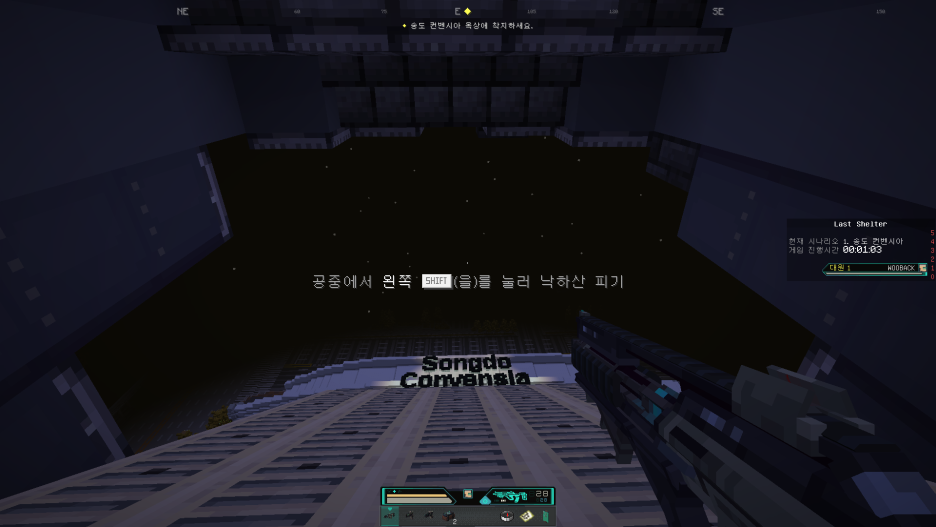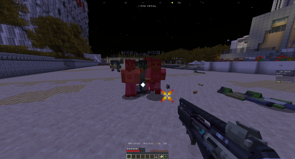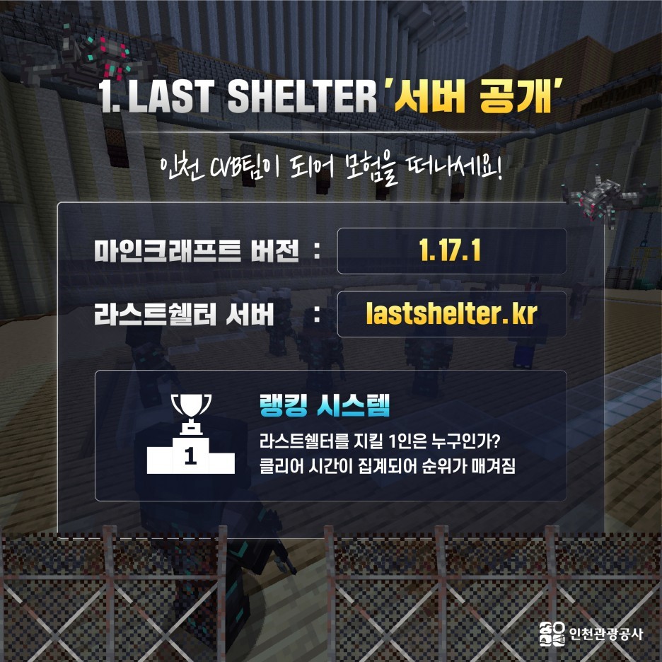 라스트 쉘터는 현실세계 인천광역시 송도 일대를 게임 속으로 옮겨와 눈길이 가는 마인크래프트 서버입니다. 단순한 도심을 인게임으로 구현한 정도가 아니라 이를 배경으로 독특한 색채의 흥미진진한 시나리오를 경험할 수 있어 매우 몰입도 높은 플레이를 진행할 수 있습니다” 그 스토리를 간단히 요약하면 플레이어가 직접 바이러스에 맞서 싸우는 인천 CVB팀의 구성원이 되어 각종 난관을 극복하고 최종 백신을 확보하는 내용이지만 시간적 배경이 미래인 SF.