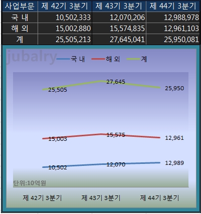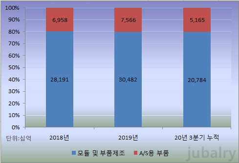 현대모비스의 매출비중 추이20년 3분기 누적으로 매출은 전년 동기 6.13% 감소하였습니다.주된 요인은 해외에 있군요.국내는 소폭이지만 해외 매출액이 16.78% 감소했습니다.국내에서 현대·기아차가 국민의 사랑을 받으며 선전했지만 해외에서는 코로나19의 영향으로 고전했습니다.
